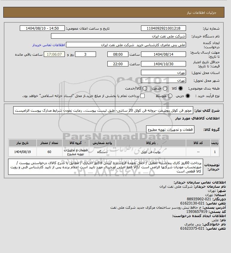 شرح کلی نیاز: موتور فن کوئل دوشفت -پروانه فن کوئل 20 سانتی- طبق لیست پیوست.. رعایت نمودن شرایط مدارک پیوست الزامیست