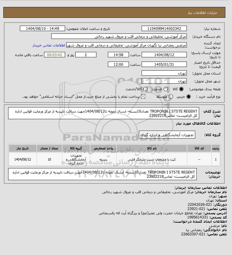 شرح کلی نیاز: TROPONIN I STSTE REGENT تعداد10بسته- ارسال نمونه تا1404/08/12جهت دریافت تاییدیه از مرکز ورعایت قوانین اداره کل الزامیست- تماس23922218