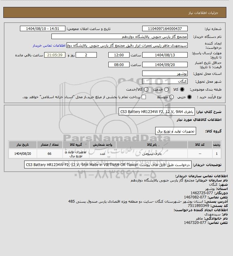 توضیحات خریدار:درخواست طبق فایل های پیوست CS3 Battery HR1234W F2, 12 V, 9AH Made in VIETNAM OR Taiwan