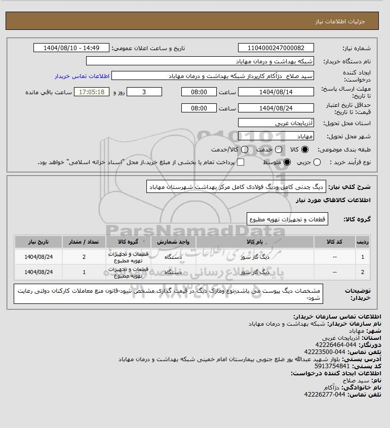 شرح کلی نیاز: دیگ چدنی کامل ودیگ فولادی کامل مرکز بهداشت شهرستان مهاباد