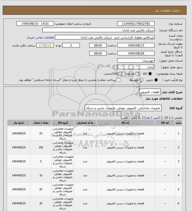| 10 | -- | قطعات و تجهیزات سربی کامپیوتر | عدد | تجهیزات مخابراتی، کامپیوتر، موبایل، ملزومات جانبی و شبکه | 15 | 1404/08/25 |