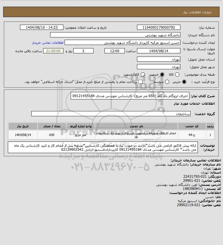 شرح کلی نیاز: اجرای ایزوگام بام گام (650 متر مربع)- کارشناس مهندس مددی 09121455184