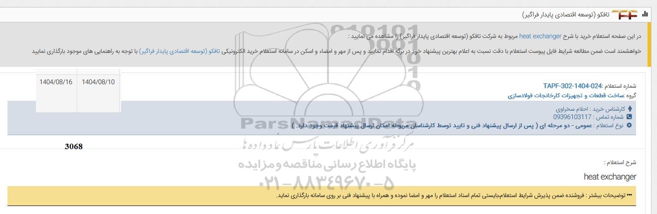 استعلام خرید با شرح heat exchanger, استعلام خرید با شرح heat exchanger