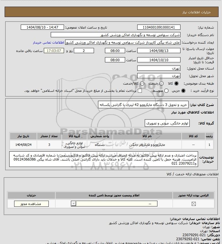 شرح کلی نیاز: خرید و تحویل 3 دستگاه مایکروویو 42 لیتری با گارانتی یکساله