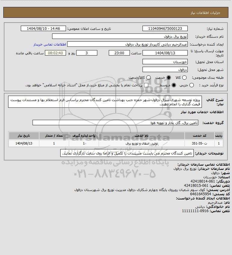 استعلام بها و موضوع استعلام استعلام پروژه توسعه شهری شرق دزفول-شهر حمزه جنب بهداشت تامین کنندگان محترم براساس فرم استعلام بها و مستندات پیوست قیمت گذاری را انجام دهند. به اطلاع کلیه شرکتها و افراد متخصص واجد شرایط میرساند، آگهی گذار در نظر دارد از طریق استعلام بها، نسبت به انتخاب و دریافت پیشنهادات اقدام نماید. این استعلام با کد آگهی ثبت شده در سامانه خبرگزاری پارس نماد : 9782393 منتشر شده است. مشخصات استعلام : تاریخ شروع استعلام: 1404/08/10 آخرین مهلت ارسال پیشنهاد قیمت : 1404/08/13 و محل اجرای پروژه : استان خوزستان میباشد. استعلام قیمت مورد درخواست : استعلام پروژه توسعه شهری شرق دزفول-شهر حمزه جنب بهداشت تامین کنندگان محترم براساس فرم استعلام بها و مستندات پیوست قیمت گذاری را انجام دهند. با دستهبندیهای تخصصی و گروه های مرتبط : پیمانکاری برق و الکترونیک, استعلام اطلاع رسانی میگردد.