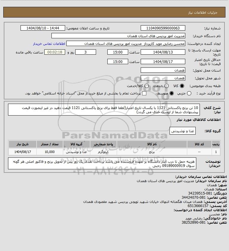 شرح کلی نیاز: 10 تن برنج پاکستانی 1121 با یکسال تاریخ اعتبار(لطفا فقط برای برنج پاکستانی 1121 قیمت دهید