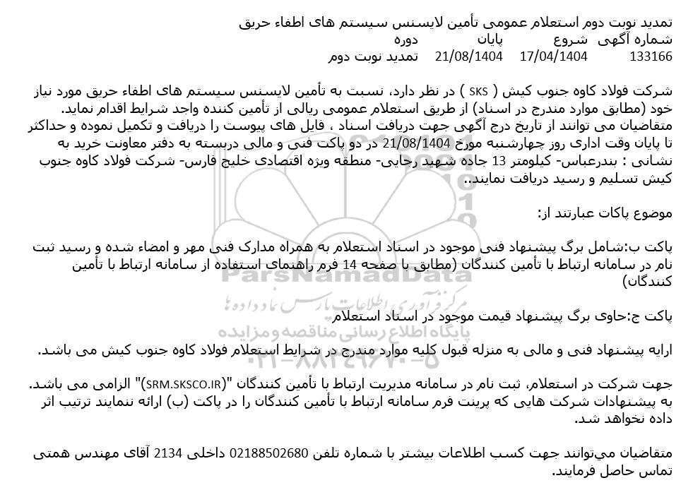 شرکت فولاد کاوه جنوب کیش ( SKS ) در نظر دارد، نسبت به تأمین لایسنس سیستم های اطفاء حریق مورد نیاز خود (مطابق موارد مندرج در اسناد) از طریق استعلام عمومی ریالی از تأمین کننده واجد شرایط اقدام نماید. متقاضیان می توانند از تاریخ درج آگهی جهت دریافت اسناد ، فایل های پیوست را دریافت و تکمیل نموده و حداکثر تا پایان وقت اداری روز4شنبه مورخ 21.08.1404 در دو پاکت فنی و مالی دربسته به دفتر معاونت خرید به نشانی : بندرعباس- کیلومتر 13 جاده شهید رجایی- منطقه ویژه اقتصادی خلیج فارس- شرکت فولاد کاوه جنوب کیش تسلیم و رسید دريافت نمايند..