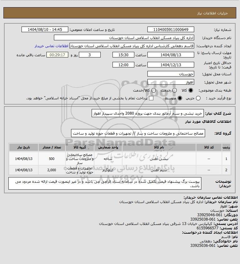 شرح کلی نیاز: خرید نبشی و سیم آرماتور بندی جهت پروژه 2080 واحدی سپیدار اهواز