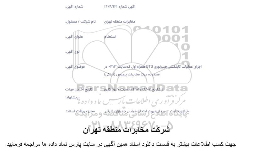 موضوع آگهی: اجرای عملیات کابلکشی فیبرنوری BTS همراه اول کد سایت 0313 در محدوده مرکز مخابرات پردیس (ترنکی )