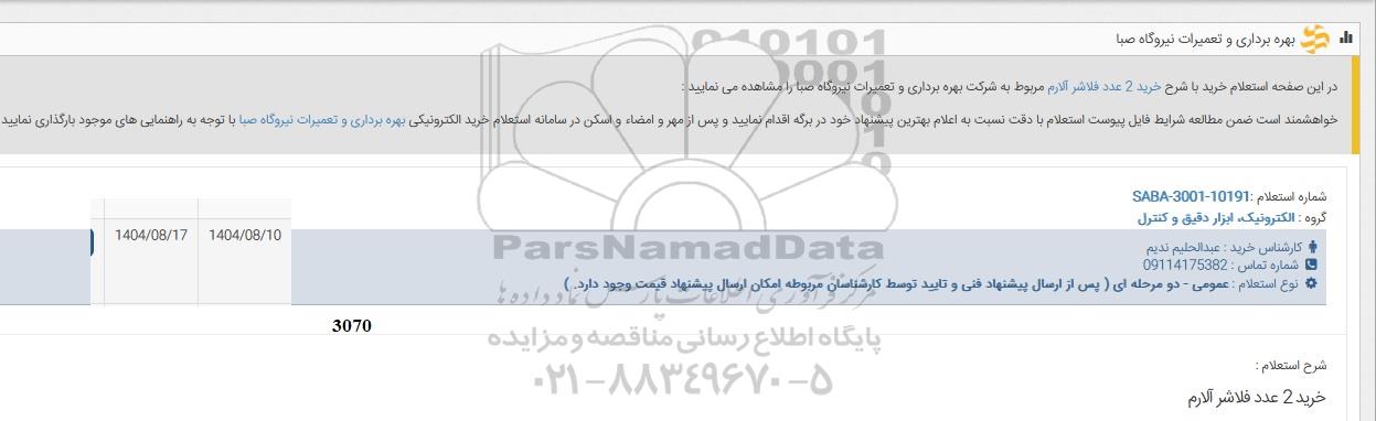 در این صفحه استعلام خرید با شرح خرید 2 عدد فلاشر آلارم مربوط به شرکت بهره برداری و تعمیرات نیروگاه صبا را مشاهده می نمایید :
