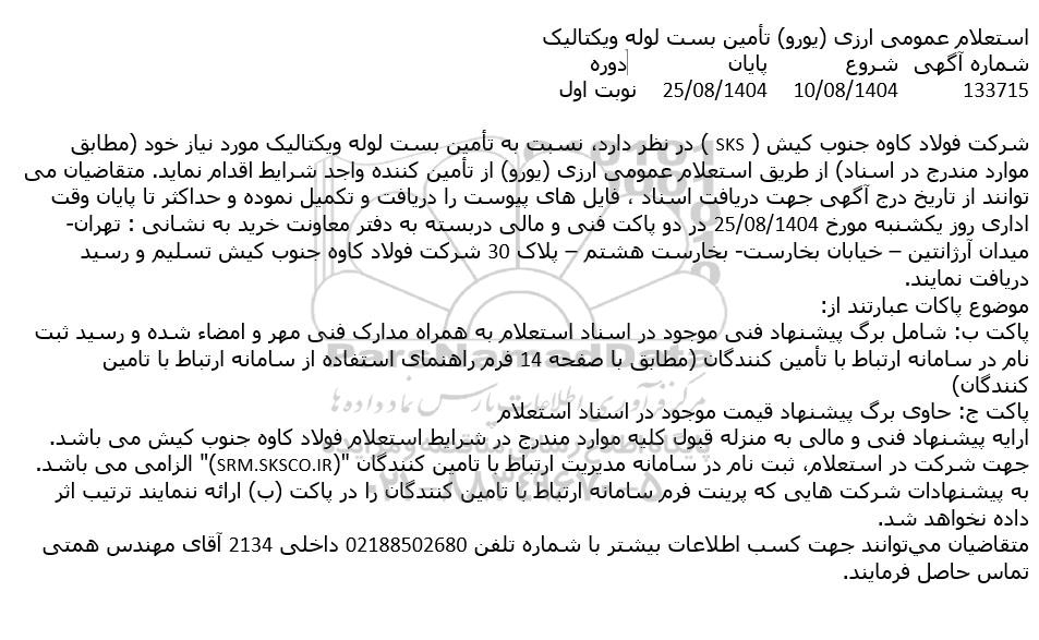 شرکت فولاد کاوه جنوب کیش ( SKS ) در نظر دارد نسبت به تامین بست لوله ویکتالیک مورد نیاز خود مطابق موارد مندرج در اسناد از طریق استعلام عمومی ارزی (یورو) از تأمین کننده واجد شرایط اقدام نماید. متقاضیان می توانند از تاریخ درج آگهی جهت دریافت اسناد ، فایلهای پیوست را دریافت و تکمیل نموده و حداکثر تا پایان وقت اداری روز یکشنبه مورخ 25.08.1404 در دو پاکت فنی و مالی دربسته به دفتر معاونت خرید به نشانی : تهران میدان آرژانتین - خیابان بخارست بخارست هشتم - پلاک 30 شرکت فولاد کاوه جنوب کیش تسلیم و رسید دریافت نمایند.