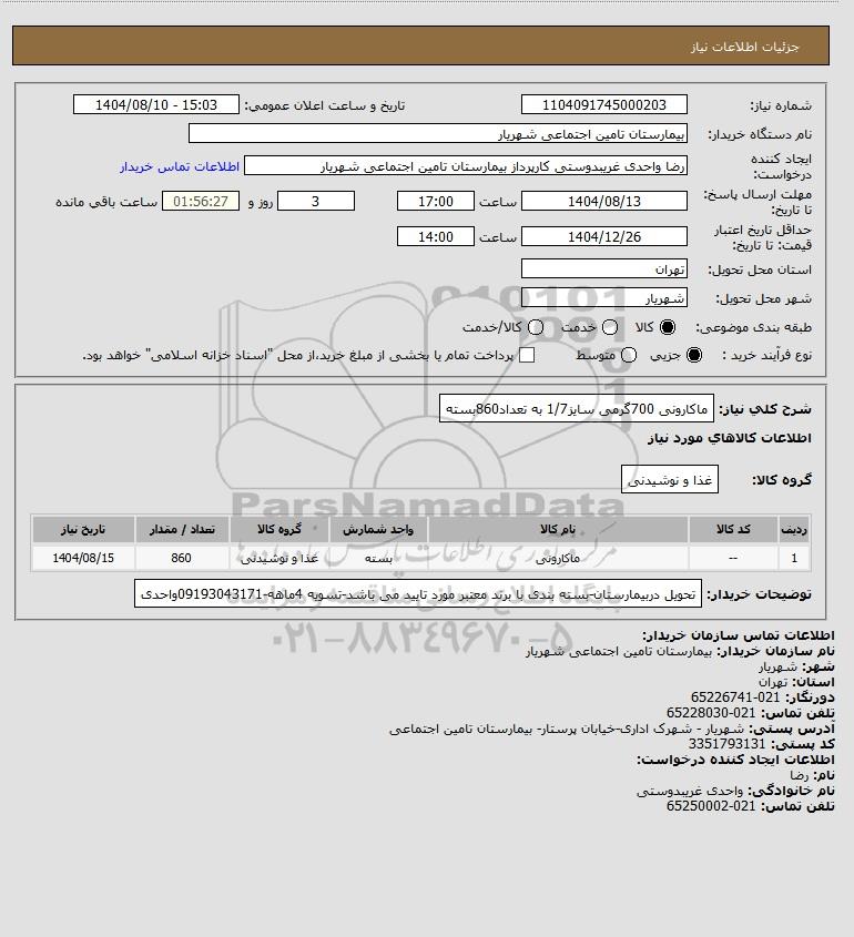 شرح کلی نیاز: ماکارونی 700گرمی سایز1/7 به تعداد860بسته