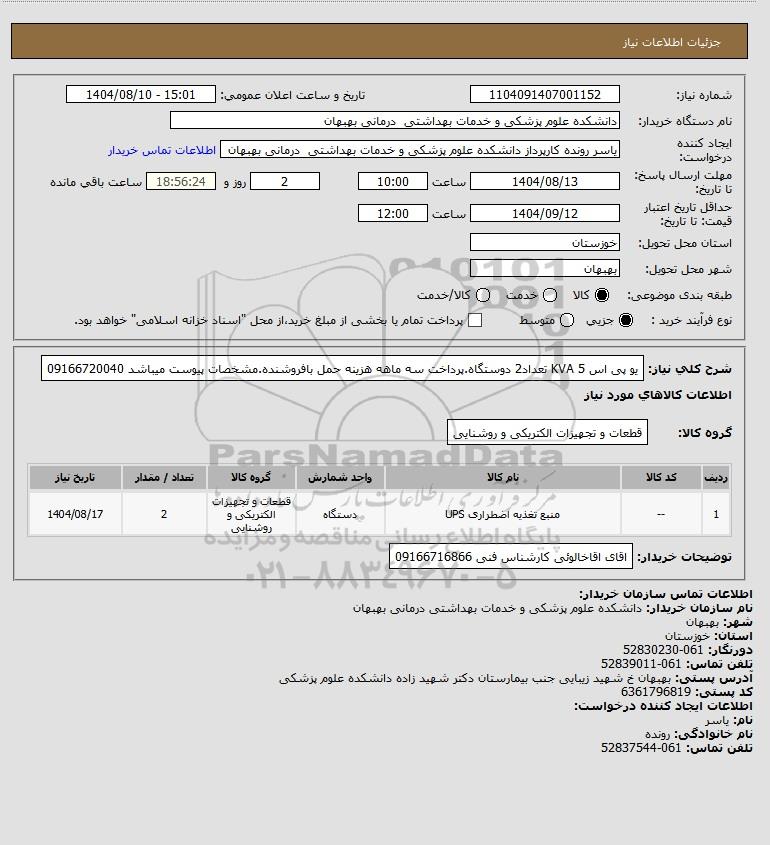| 1 | -- | منبع تغذیه اضطراری UPS | دستگاه | قطعات و تجهیزات الکتریکی و روشنایی | 2 | 1404/08/17 |