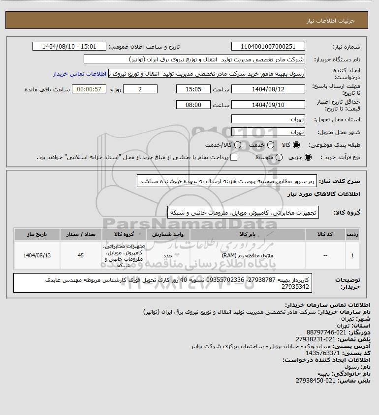 نام سازمان خریدار: شرکت مادر تخصصی مدیریت تولید انتقال و توزیع نیروی برق ایران (توانیر)