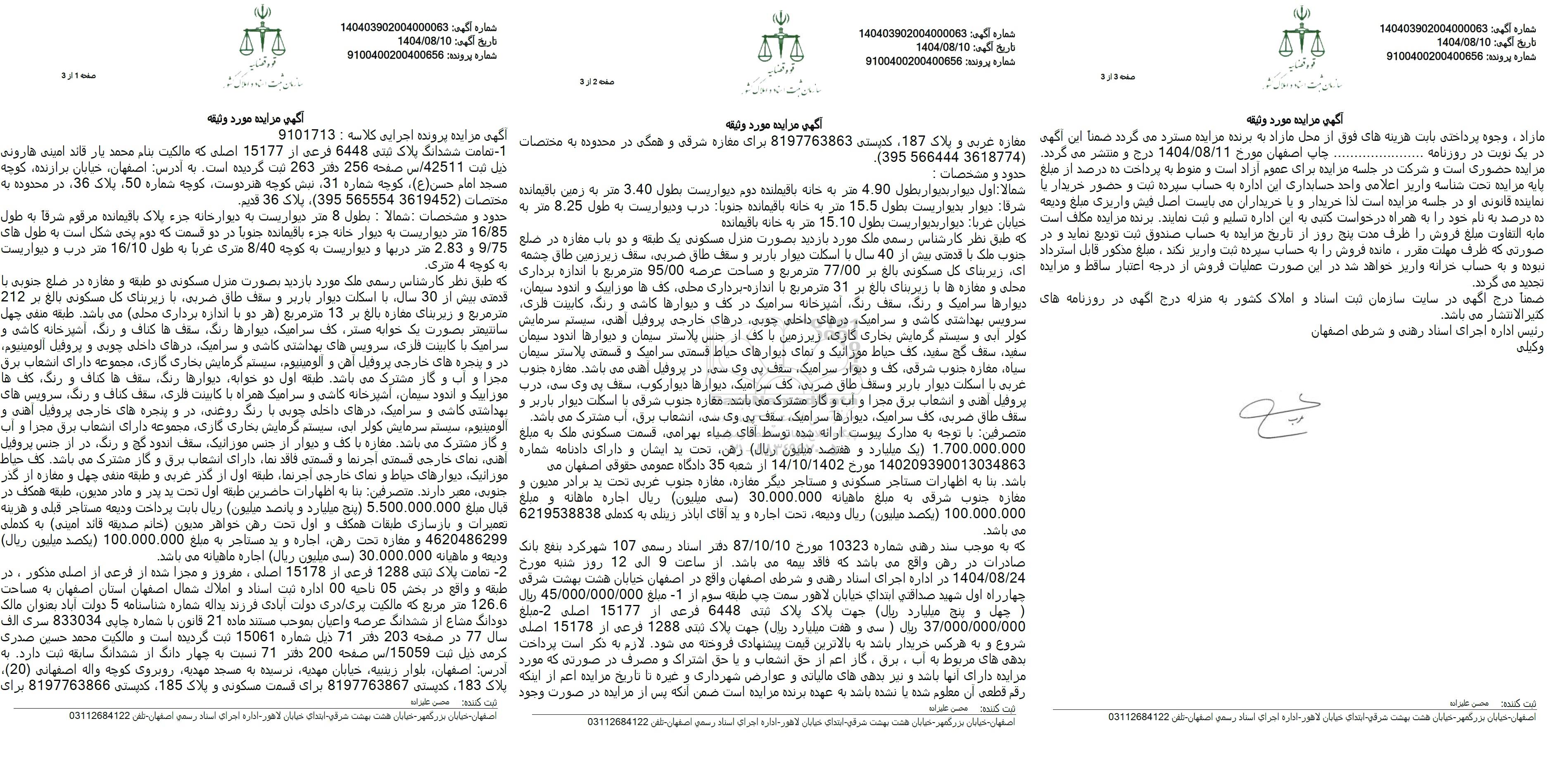 که به موجب سند رهنی شماره 10323 مورخ 87.10.10 دفتر اسناد رسمی 107 شهر کرد بنفع بانک صادرات در رهن واقع می باشد که فاقد بیمه می باشد. از ساعت 9 الی 12 روز شنبه مورخ 1404.08.24 در اداره اجرای اسناد رهنی و شرطی اصفهان واقع در اصفهان خیابان هشت بهشت شرقی چهار راه اول شهید صداقتی ابتدای خیابان لاهور سمت چپ طبقه سوم از -1 مبلغ 45.000.000.000 ریال چهل و پنج میلیارد ریال جهت پلاک پلاک ثبتی 6448 فرعی از 15177 اصلی 2- مبلغ 37.000.000.000 ریال  سی و هفت میلیارد ریال جهت پلاک ثبتی 1288 فرعی از 15178 اصلی شروع و به هر کس خریدار باشد به بالاترین قیمت پیشنهادی فروخته میشود لازم به ذکر است پرداخت بدهی های مربوط به آب ، برق ، گاز اعم از حق انشعاب و یا حق اشتراک و مصرف در صورتی که مورد مزایده دارای آنها باشد و نیز بدهیهای مالیاتی و عوارض شهرداری و غیره تا تاریخ مزایده اعم از اینکه رقم قطعی آن معلوم شده یا نشده باشد به عهده برنده مزایده است ضمن آنکه پس از مزایده در صورت وجود مازاد ، وجوه پرداختی بابت هزینه های فوق از محل مازاد به برنده مزایده مسترد میگردد ضمنا این آگهی در یک نوبت در روزنامه چاپ اصفهان مورخ 1404.08.11 درج و منتشر می گردد.