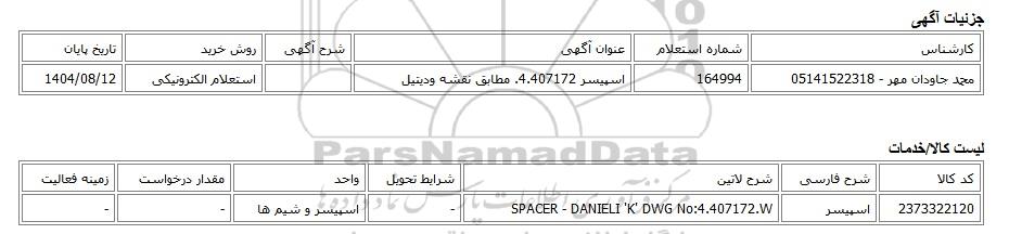 | محمد جاودان مهر - 05141522318 | 164994 | اسپیسر 4.407172. مطابق نقشه ودیتیل | استعلام الکترونیکی | 1404/08/12 |