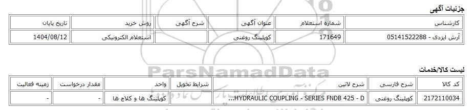 | آرش ایزدی - 05141522288 | 171649 | کوپلینگ روغنی | استعلام الکترونیکی | 1404/08/12 |