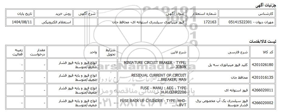 | مهران دیوان - 05141522301 | 172163 | فیوز مینیاتوری سیلندری استوانه ای- محافظ جان | استعلام الکترونیکی | 1404/08/11 |