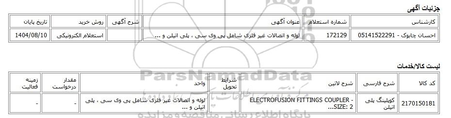 | احسان چابوک - 05141522291 | 172129 | لوله و اتصالات غیر فلزی شامل پی وی سی ، پلی اتیلن و ... | استعلام الکترونیکی | 1404/08/10 |