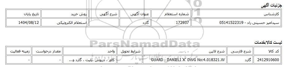 | سیدامیر حسینی راد - 05141522319 | 172937 | گارد | استعلام الکترونیکی | 1404/08/12 |
