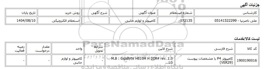 | علی ناصرنیا - 05141522299 | 172135 | کامپیوتر و لوازم جانبی | استعلام الکترونیکی | 1404/08/10 |