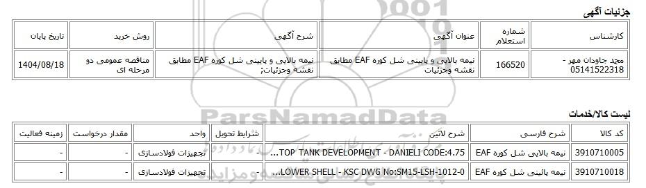 | محمد جاودان مهر - 05141522318 | 166520 | نیمه بالایی و پایینی شل کوره EAF مطابق نقشه وجزئیات | نیمه بالایی و پایینی شل کوره EAF مطابق نقشه وجزئیات; | مناقصه عمومی دو مرحله ای | 1404/08/18 |