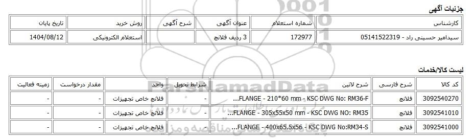 | سیدامیر حسینی راد - 05141522319 | 172977 | 3 ردیف فلانچ | استعلام الکترونیکی | 1404/08/12 |