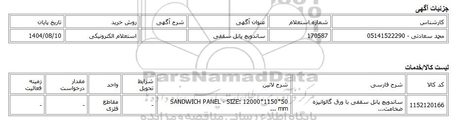 محمد سعادتی - 05141522290170587ساندویچ پانل سقفیاستعلام الکترونیکی1404/08/10