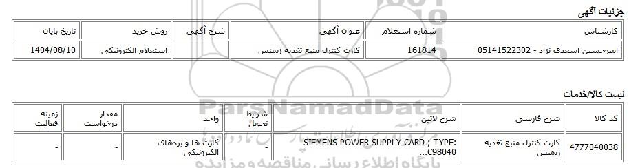 | امیرحسین اسعدی نژاد - 05141522302 | 161814 | کارت کنترل منبع تغذیه زیمنس | استعلام الکترونیکی | 1404/08/10 |