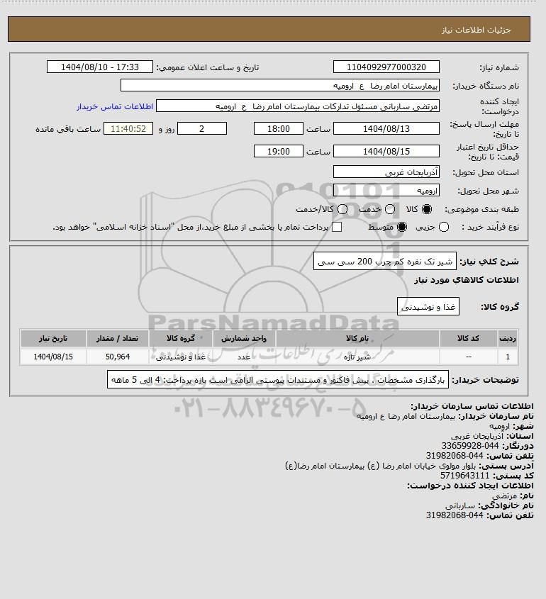 شرح کلی نیاز: شیر تک نفره کم چرب 200 سی سی