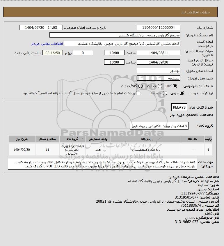| 1 | -- | رله الکترومغناطیسی | عدد | قطعات و تجهیزات الکتریکی و روشنایی | 11 | 1404/09/30 |