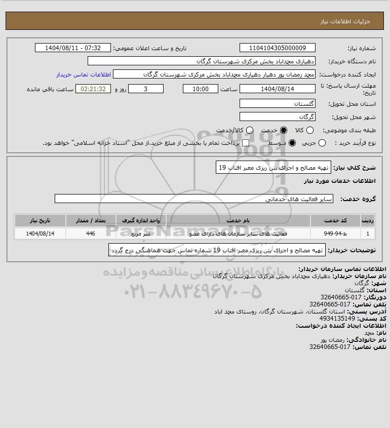 شرح کلی نیاز: تهیه مصالح و اجرای بتن ریزی معبر افتاب 19
