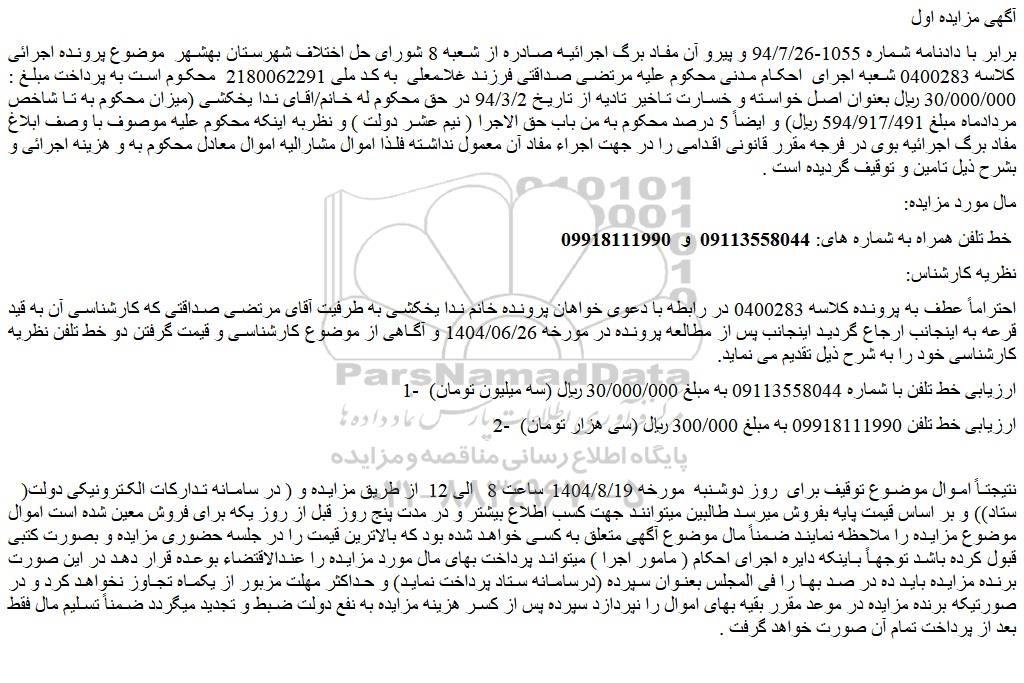 1- ارزیابی خط تلفن با شماره 09113558044 به مبلغ 30/000/000 ریال (سه میلیون تومان)