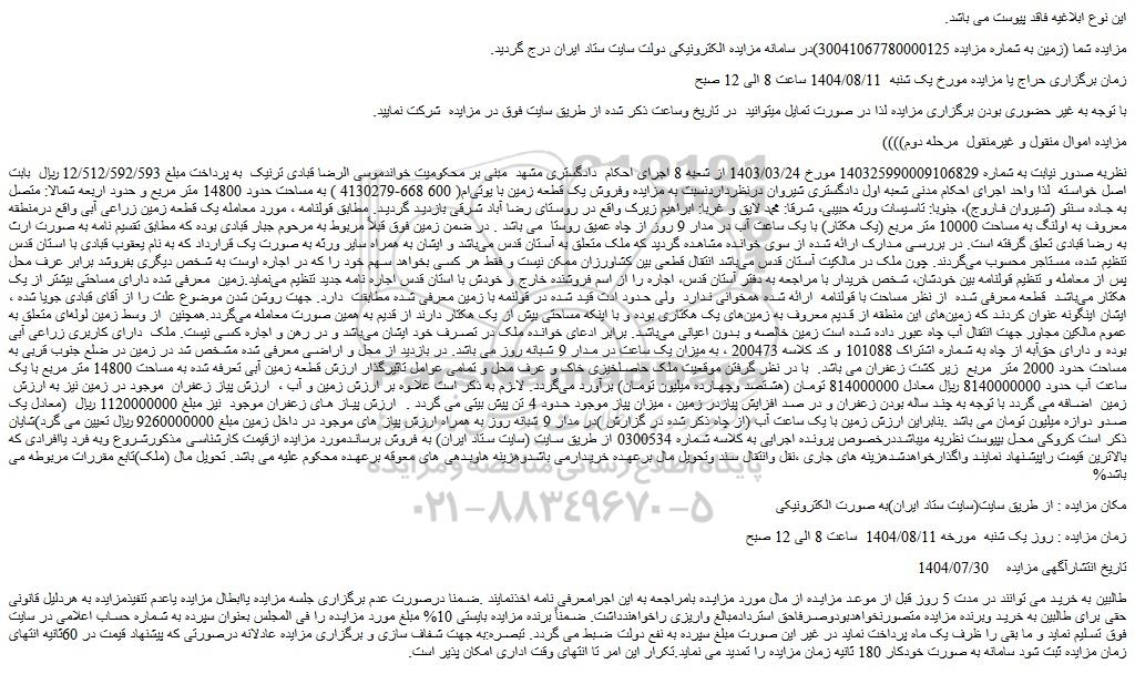 زمان مزایده : روز یک شنبه مورخه 1404/08/11 ساعت 8 الی 12 صبح