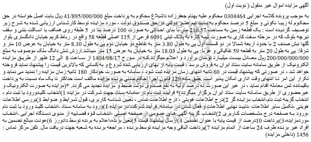 به موجب پرونده کلاسه اجرایی 0304464 محکوم علیه بهنام جعفرزاده داشبلاغ محکوم به پرداخت مبلغ 41/895/000/000 ریال بابت اصل خواسته در حق محکوم له زیبا نکوئی و مبلغ 5 درصد محکوم به بابت نیم عشر دولتی در حق صندوق دولت ، مورد مزایده توسط کارشناس ارزیابی شده به شرح زیر توصیف گردیده است : یک قطعه زمین به مساحت 210.57 متر با بنای احداثی به صورت 100 درصد بنا در 5 طبقه روی همکف با اسکلت بتنی و سقف تیرچه بلوک که در مرحله سفت کاری به صورت نیمه کاره به پلاک ثبتی 6091 فرعی از 115 اصلی قطعه 58 واقع در رباط کریم خیابان دادگستری بلوار گلها نبش صدف 2 با حدود اربعه شمالا در دو قسمت اول پی به طول 3.80 متر به تقاطع دو خیابان دوم پی به طول 8.30 متر به خیابان به عرض 10 متر و شرقا: پی به طول 20 متر به قطعه 59 تفکیکی و غربا: پی به طول 18.03 متر به خیابان به عرض 15 متر میباشد.ارزش شش دانگ ملک موصوف به مبلغ 200/000/000/000 ریال معادل بیست میلیارد تومان برآورد و اعلام میگردد.که در مورخ 1404/08/17 از ساعت 8 الی 12 ظهر از طریق مزایده الکترونیک از طریق سامانه سایت ستاد ایران به فروش برسد ، قیمت پایه از بهای ارزیابی شده شروع و به کسانی که بالاترین قیمت را پیشنهاد نماید فروخته خواهد شد ، در صورتی که پیشنهاد قیمت در 60 ثانیه انتهای زمان مزایده ثبت شود ، سامانه به صورت خودکار 180 ثانیه زمان مزایده را تمدید می نماید و تکرار این امر تا انتهای وقت اداری امکان پذیر است .طبق ماده 129 قانون اجرا احکام مدنی برنده مزایده مکلف است حداکثر تا یک ماه نسبت به پرداخت باقیمانده ثمن معامله اقدام نماید ، در غیر این صورت ده درصد اولیه به نفع صندوق دولت ضبط و مزایده تجدید می گردد. *(مزایده به صورت الکترونیک و غیرحضوری از طریق سامانه سایت ستاد ایران برگزار میگردد)* فرآیند ثبت نام در سامانه ستاد جهت شرکت در مزایده 1)انتخاب کلیدورود یا ثبت نام -انتخاب گزینه ثبت نام-انتخاب مزایده گر 2)درج اطلاعات هویتی ، درج اطلاعات تماس ، تعیین شناسه کاربری، قبول شرایط و ضوابط 3)بررسی اطلاعات هویتی ،تکمیل سایر اطلاعات ،تایید نهایی اطلاعات و فعال شدن در سامانه. فرآیند شرکت در مزایده 1)ورود به سامانه ستاد ،انتخاب کلید ورود یا ثبت نام ،ورود به صفحه درج مشخصات کاربری 2)انتخاب گزینه آگهی های عمومی از صفحه اصلی ،انتخاب قوه قضاییه از منوی دستگاه اجرایی ،انتخاب موردمزایده،3)پرداخت 10درصد از قیمت پایه با عنوان تضمین 4)ارسال پیشنهاد قیمت 5)تعین برنده،اعلام به برنده توسط دادورز 6)عودت مبالغ تضمین به افراد غیر برنده ظرف 24 ساعت از اتمام مزایده 7)پرداخت الباقی وجه مزایده توسط برنده ، مراجعه برنده به شعبه جهت دریافت مال. تلفن مرکز تماس : 1456 (داخلی مزایده)