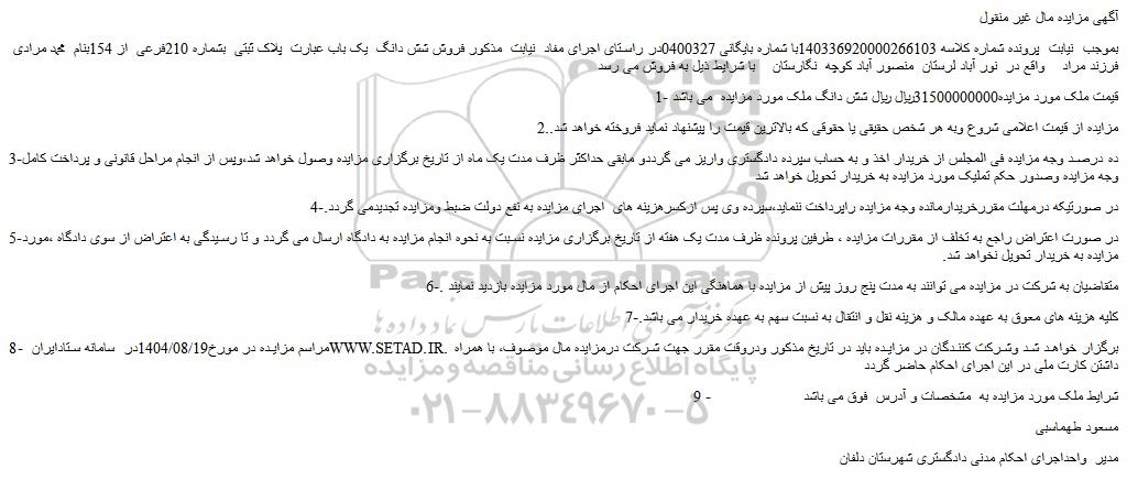 بموجب نیابت پرونده شماره کلاسه 140336920000266103با شماره بایگانی 0400327در راستای اجرای مفاد نیابت مذکور فروش شش دانگ یک باب عبارت پلاک ثبتی بشماره 210فرعی از 154بنام محمد مرادی فرزند مراد واقع در نور آباد لرستان منصور آباد کوچه نگارستان با شرایط ذیل به فروش می رسد