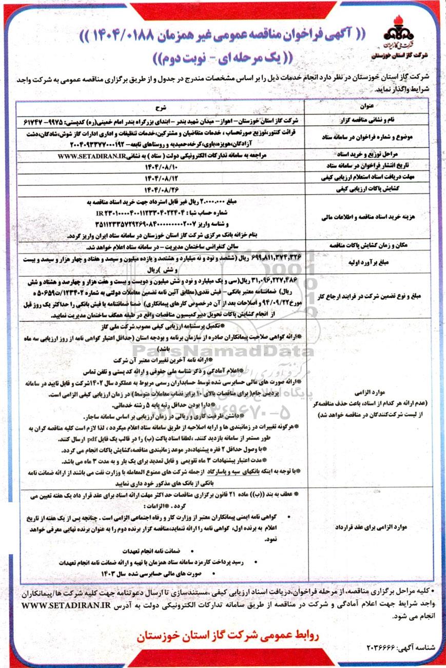 شرکت گاز استان خوزستان در نظر دارد انجام خدمات ذیل را براساس مشخصات مندرج در جدول و از طریق برگزاری مناقصه عمومی به شرکت واجد شرایط واگذار نماید.
