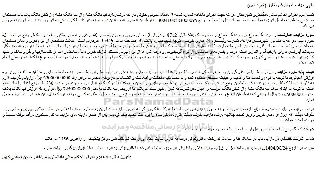 شعبه دوم اجرای احکام مدنی دادگستری شهرستان مراغه جهت اجرای دادنامه شماره شعبه 5 دادگاه عمومی حقوقی مراغه درنظردارد نیم دانگ مشاع از سه دانگ مشاع از شش دانگ یک باب ساختمان مسکونی متعلق به فاضل آذری بخواسته با مشخصات ذیل با شماره حراج 3004108583000095 را ازطریق انجام مزایده آنلاین در سامانه تدارکات الکترونیکی به آدرس سایت ستاد ایران به فروش برساند .