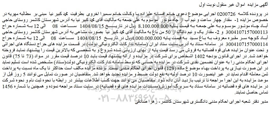در پرونده کلاسه  0200726 اجرایی موضوع دعوی خانم افسانه علیزاده با وکالت خانم سمیرا اخروی  بطرفیت  محمد کبیر نیا  مبنی بر  مطالبه مهریه در خصوص مزایده 1-  مقدار چهار ساعت و نیم آب از چاه موتور  موسوم به علی جمعه به مالکیت آقای محمد کبیر نیا به آدرس شهرستان کاشمر روستای حاجی آباد چاه موتور موسوم به علی جمعه به قیمت پایه 8.100.000.000  ریال در تاریخ 1404/08/15  ساعت  08  الی 12 به شماره حراج 3004107157000113  و 2- مقدار یک و نیم دانگ از 50 من باغ به مالکیت آقای محمد کبیر نیا  بصورت مشاعی به آدرس شهرستان کاشمر روستای حاجی آباد کوچه سر مقبره معروف به باغ سید  به قیمت پایه 4.000.000.000ریال در تاریخ  1404/08/15  ساعت  08  الی 12 به شماره حراج 3004107157000114  در  سامانه ستاد به آدرس سایت ستاد ایران (سامانه تدارکات الکترونیکی دولت) در قسمت مزایده های حراج دستگاه های اجرائی و تحت عنوان مزایده های قوه قضائیه به فروش می رسد قیمت پایه از بهای ارزیابی شده شروع و به شخصی که بالاترین قیمت را پیشنهاد نماید فروخته خواهد شد. در اجرای قانون بودجه 1402 اشخاص برای شرکت در مزایده و ارائه پیشنهاد قیمت باید 10 درصد قیمت مقرر در مواد (73 تا 75) قانون اجرای احکام مدنی را به عنوان تضمین نقدی شرکت در مزایده به حسابی که توسط سامانه تدارکات الکترونیکی دولت(ستاد) مشخص شده است تسلیم نماید در این صورت نیازی به پرداخت بهاء موضوع ماده (129) قانون اجرای احکام مدنی نیست. برنده مزایده مکلف است حداکثر تا یک ماه نسبت به پرداخت ثمن معامله اقدام نماید در غیر اینصورت 10 درصد اولیه به نفع دولت ضبط و مزایده تجدید خواهد شد. متقاضیان در صورت تمایل می توانند 5 روز قبل از موعد مزایده به این اجرا مراجعه تا ترتیب بازدید آنان داده شود. متقاضیان می توانند جهت کسب اطلاعات بیشتر در رابطه با نحوه ثبت نام و نحوه شرکت در مزایده های قوه قضائیه در سامانه ستاد به سربرگ آموزش(مستندات مزایده های قوه قضائیه) در سایت ستاد مراجعه نموده و همچنین با شماره 1456 تماس حاصل نمایند.