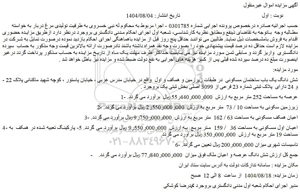 شعبه صادر کننده:شعبه اول اجرای احکام مدنی دادگستری شهرستان بروجرد