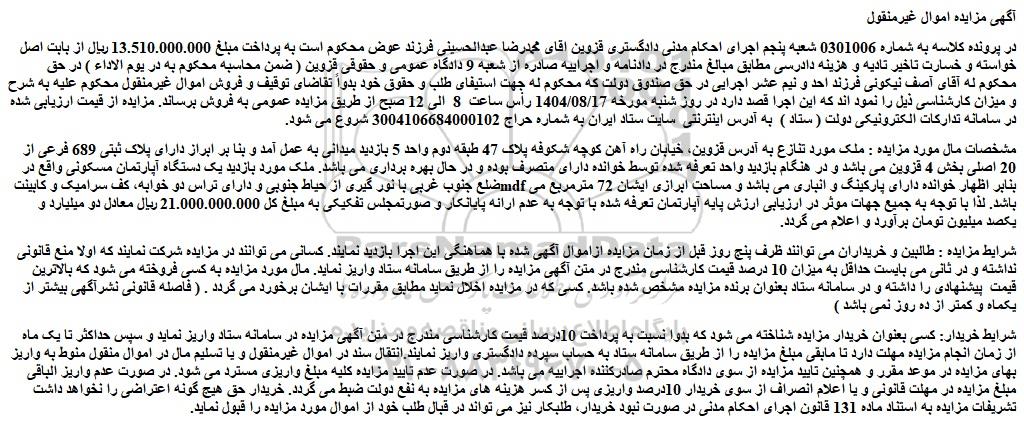 در پرونده کلاسه به شماره 0301006 شعبه پنجم اجرای احکام مدنی دادگستری قزوین اقای محمدرضا عبدالحسینی فرزند عوض محکوم است به پرداخت مبلغ 13.510.000.000 ریال از بابت اصل خواسته و خسارت تاخیر تادیه و هزینه دادرسی مطابق مبالغ مندرج در دادنامه و اجراییه صادره از شعبه 9 دادگاه عمومی و حقوقی قزوین ( ضمن محاسبه محکوم به در یوم الاداء ) در حق محکوم له آقای آصف نیکوئی فرزند احد و نیم عشر اجرایی در حق صندوق دولت که محکوم له جهت استیفای طلب و حقوق خود بدواً تقاضای توقیف و فروش اموال غیرمنقول محکوم علیه به شرح و میزان کارشناسی ذیل را نمود اند که این اجرا قصد دارد در روز شنبه مورخه 1404/08/17 رأس ساعت 8 الی 12 صبح از طریق مزایده عمومی به فروش برساند. مزایده از قیمت ارزیابی شده در سامانه تدارکات الکترونیکی دولت ( ستاد ) به آدرس اینترنتی سایت ستاد ایران به شماره حراج 3004106684000102 شروع می شود.