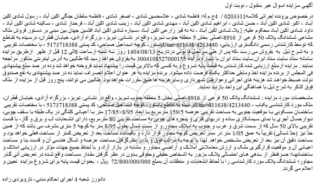 درخصوص پرونده اجرائی کلاسه0203311 / 4ج م له: فاطمه شادی - غلامحسین شادی - اصغر شادی - فاطمه سلطان جنگی اکین آباد - رسول شادی اکین آباد - اکبر شادی اکین آباد - حسن شادی - ابراهیم شادی اکین آباد - مهدی شادی اکین آباد - زینب شادی اکین آباد - فرحناز شادی - سکینه شادی اکین آباد - داود شادی اکین آباد محکوم علیه: ژیلا شادی اکین آباد - نه نه قیز زارعی اکین آباد -سیاره شادی اکین آباد افشین جهان بین مبنی بر دستور فروش ملک مشاعی ششدانگ پلاک 50 فرعی از 8916-اصلی بخش 5 منطقه جنوب تبریز، واقع در نشانی: تبریز، بزرگراه آزادی، خیابان قطران، نرسیده به تقاطع پاستور، کوچه اسماعیل صباحی، کد پستی 5173718388 ، با مختصات تقریبی utm=611638/4213440 ،که توسط کارشناس رسمی دادگستری ارزیابی و به شرح ذیل به بفروش می رسد ،که پس از طی مـراحـل قا نونی درتاریخ 1404/08/13 روز سه شنبه ازساعت 8الی 12 قبل از ظهر ازطریق مزایده سامانه ستاد سایت ستاد ایران.سایت ستاد ایران با شماره مزایده 3004108527000155 به بفروش خواهد رسید که طالبین به آدرس اینترنتی مذکور مراجعه نمایند . مزایده ازمبلغ ارزیابی شده کارشناس به قیمت پایه شروع و به کسی که بالاترین قیمت را پیشنهاد نماید فروخته خواهد شد وده در صد مبلغ پیشنهادی فی المجلس از برنده مزایده اخذ ومابقی حداکثر یکماه فرصت داده میشود. برنده مزایده به هر عنوان اعلام انصراف نماید ده در صد پیشنهادی به نفع صندوق دولت ضبط خواهد شد هزینه های اجرائی وعوارض شهرداری وسایرهزینه ها طبق مقررات خواهد بود .طالبین می توانند، پنج روز قبل از مزایده از ملک فوق الذکر به شرح ذیل با هماهنگی این واحد بازدید نمایند.