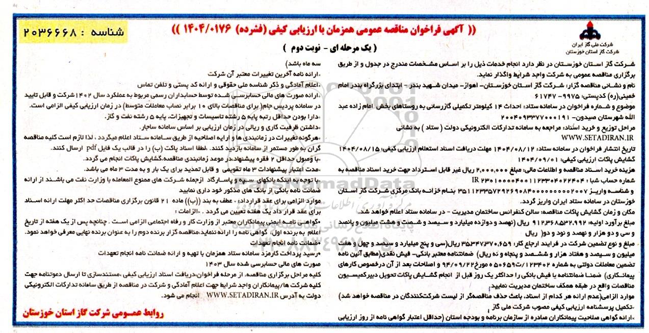 مناقصه عمومی احداث 14 کیلومتر تکمیلی گازرسانی به روستاهای بخش امام زاده عبدالله...- نوبت دوم از کلیه افراد متخصص و شرکتها واجد شرایط دعوت به عمل میآید در مناقصه با کد خبرگزاری پارس نماد: 9784458 شرکت نمایند.