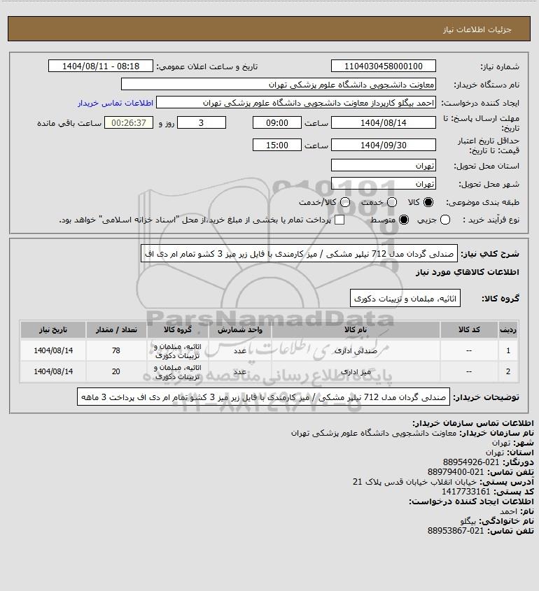 شرح کلی نیاز: صندلی گردان مدل 712 نیلپر مشکی / میز کارمندی با فایل زیر میز 3 کشو تمام ام دی اف
