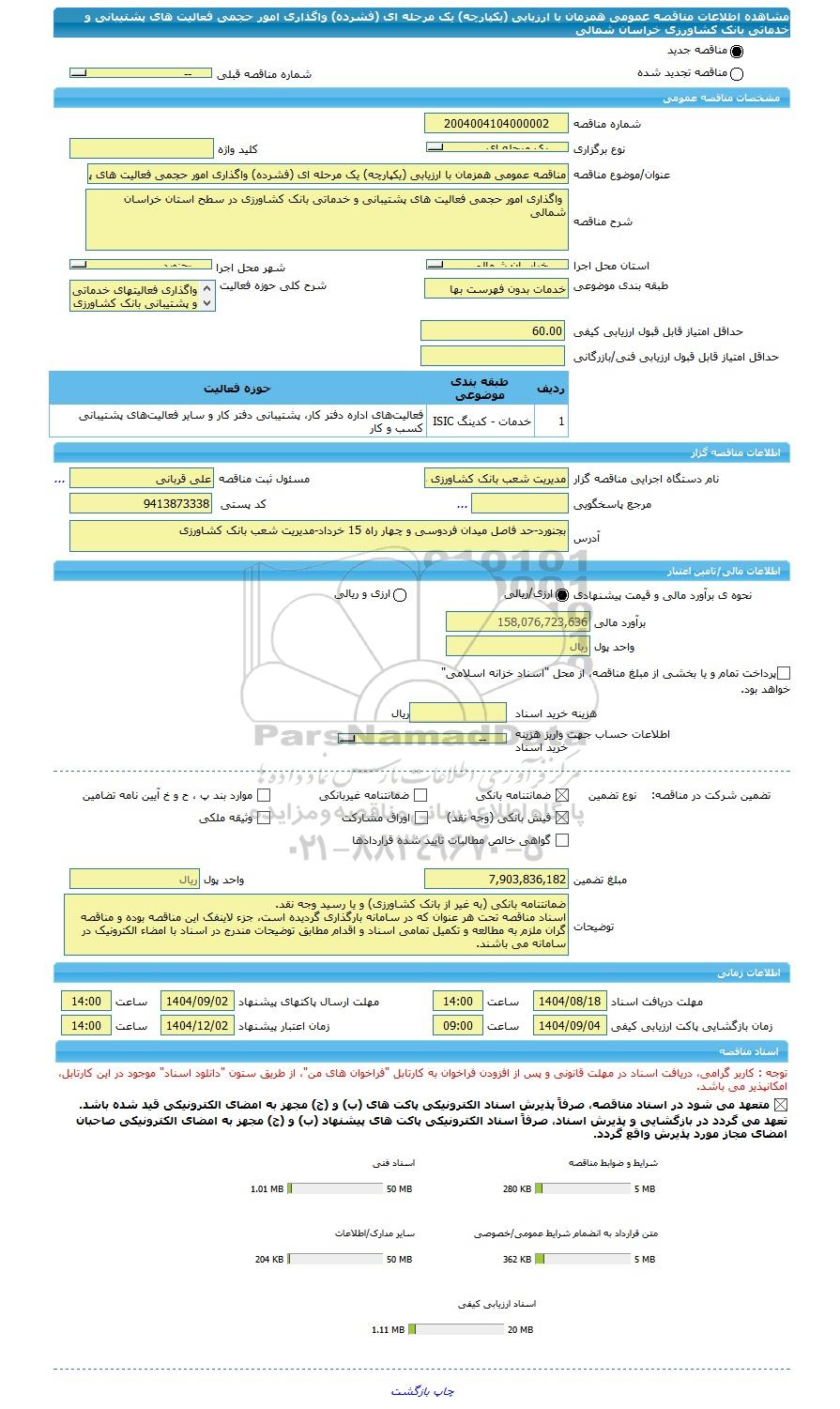 | شرح مناقصه | واگذاری امور حجمی فعالیت های پشتیبانی و خدماتی بانک کشاورزی در سطح استان خراسان شمالی | ||||||||