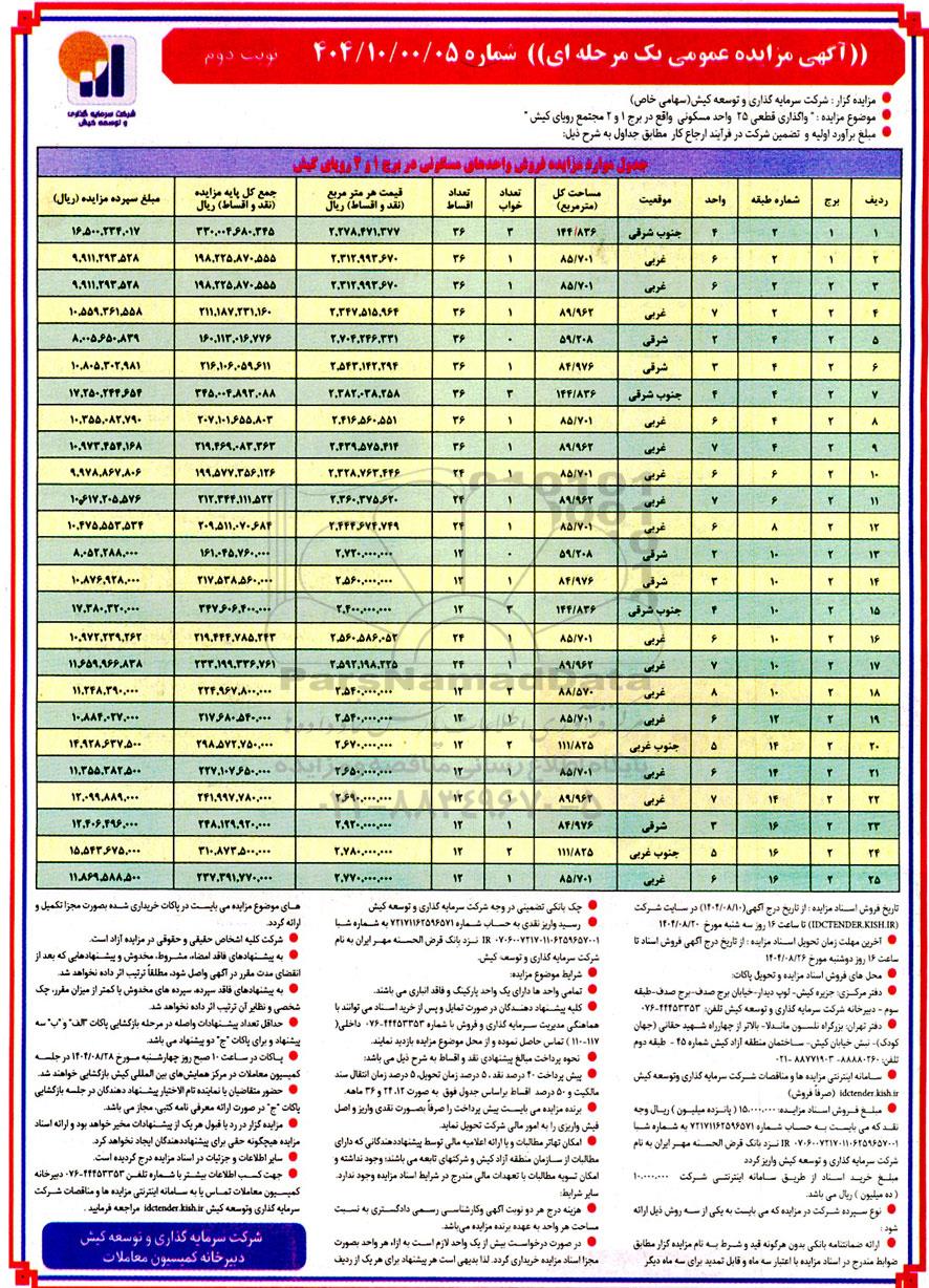 جدول موارد مزایده فروش واحدهای مسکونی در برج 1 و 2 رویای کیش