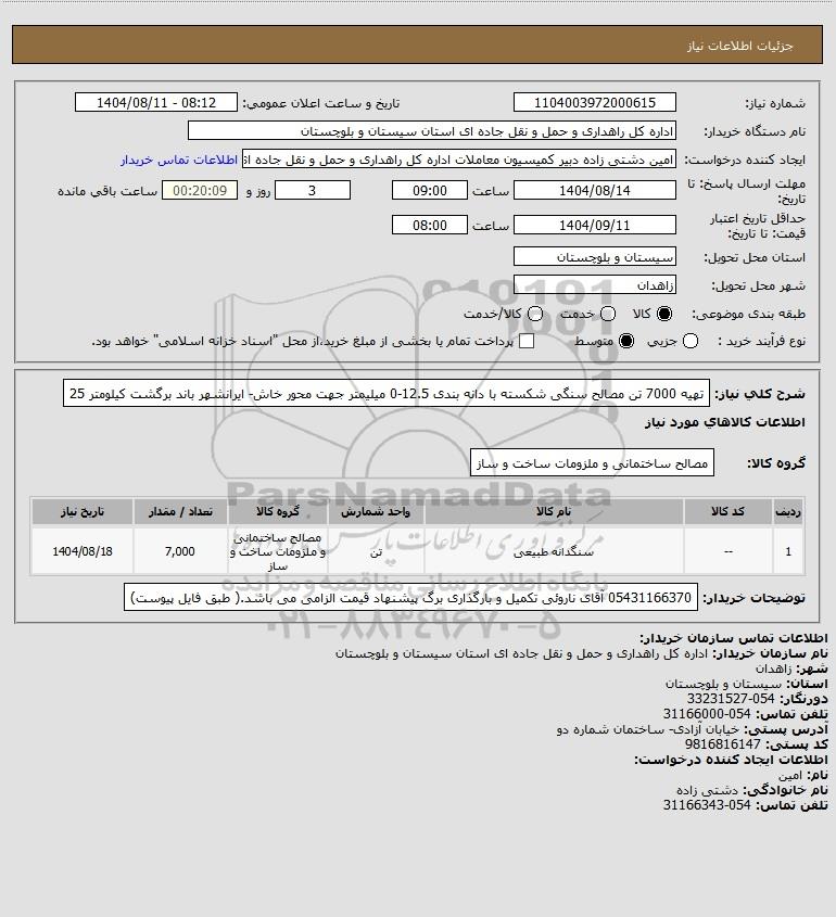 شرح کلی نیاز: تهیه 7000 تن مصالح سنگی شکسته با دانه بندی 12.5-0 میلیمتر جهت محور خاش- ایرانشهر باند برگشت کیلومتر 25