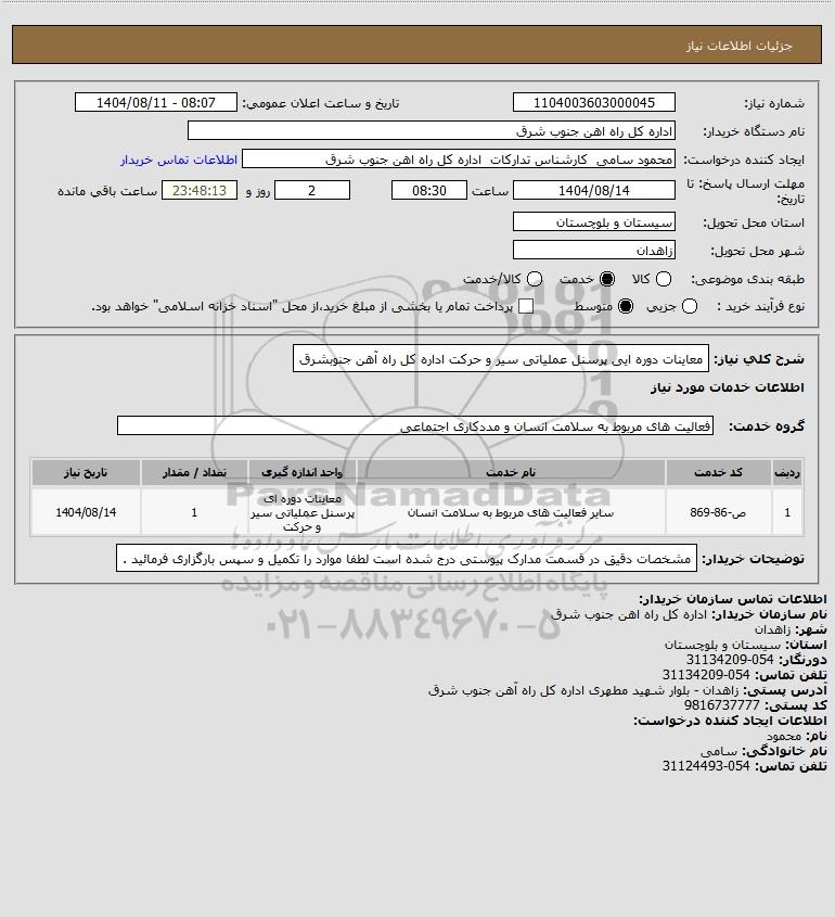 شرح کلی نیاز: معاینات دوره ایی پرسنل عملیاتی سیر و حرکت اداره کل راه آهن جنوبشرق