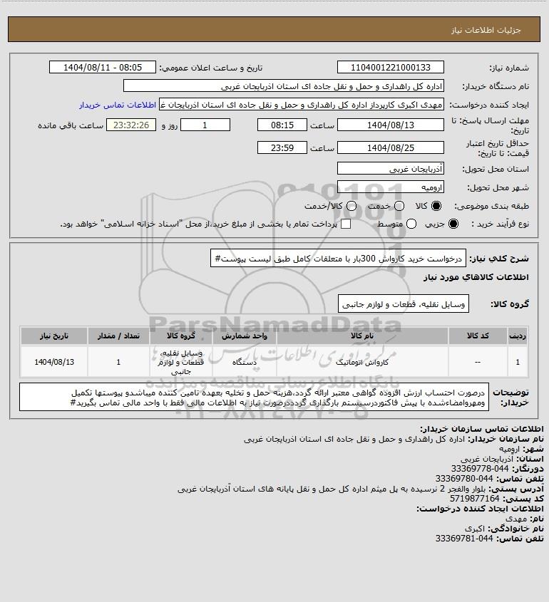 شرح کلی نیاز: درخواست خرید کارواش 300بار با متعلقات کامل طبق لیست پیوست#