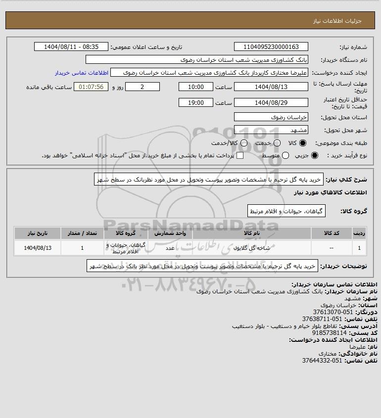 شرح کلی نیاز: خرید پایه گل ترحیم با مشخصات وتصویر پیوست وتحویل در محل مورد نظربانک در سطح شهر